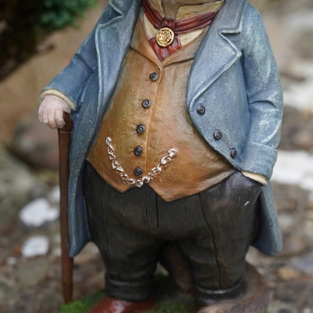 Denne sjarmerende oteren er kledd i frakk, vest og hatt, og støtter seg på en klassisk spaserstokk som gir figuren et karakterfullt og sofistikert uttrykk. De mange små detaljene i klærne og ansiktet gir figuren et nesten eventyrlig preg, som om den har vandret rett ut av en klassisk illustrert barnebok.