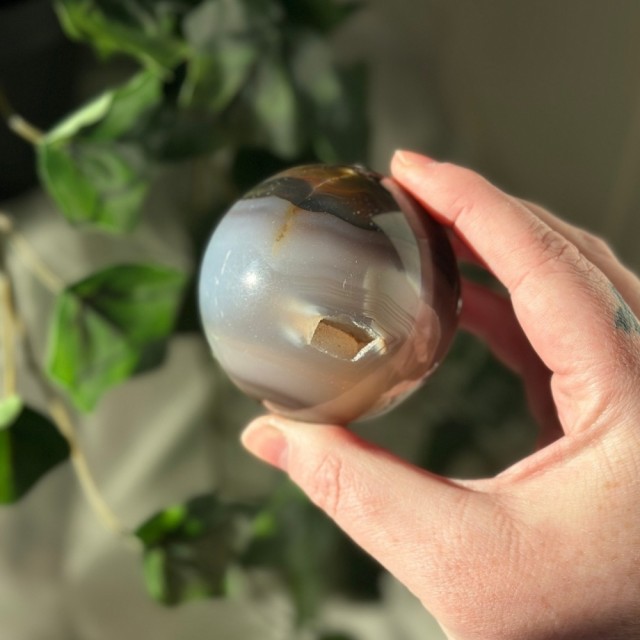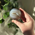 Agat måne med drusy lomme i seg. Denne er 4,5x3,6x1,5cm og veier ca 42,7cm. Det er den på bildet du får hvis du bestiller denne. Naturlige merker forekommer.