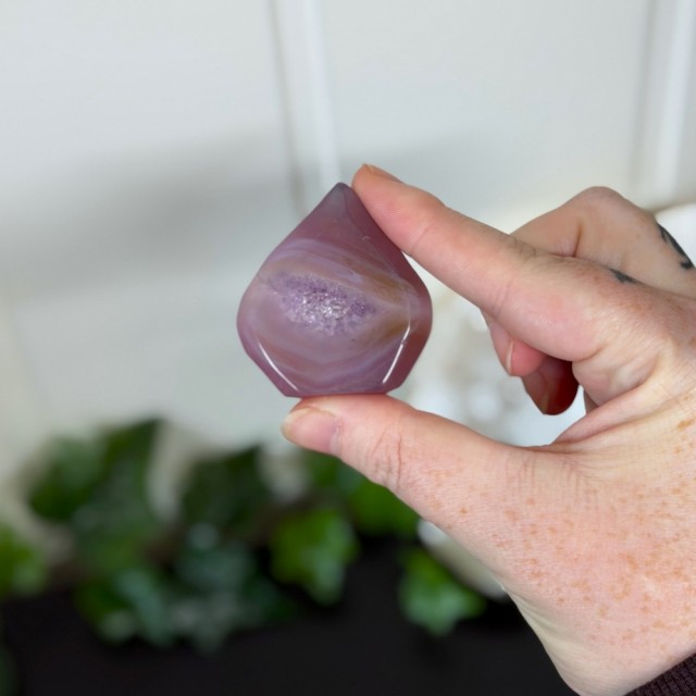 Nydelig lilla farget agat med drusy i seg. Denne er farget/dyed rosa. Størrelse: 4,8cm.