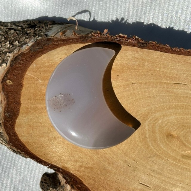 Nydelig grå Agat måne, dette har pittelitt drusy på seg samt litt dendritt (små prikkene). Dette er 5,4x3,9x1,2cm og veier ca 40g. Det er den krystallen på bildene du får hvis du bestiller denne. PS: Små naturlige merker forekommer på disse Agatene.
