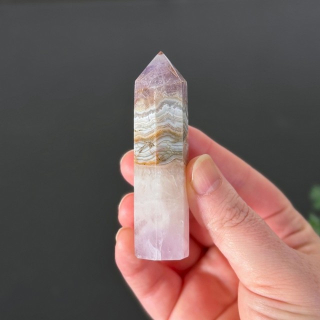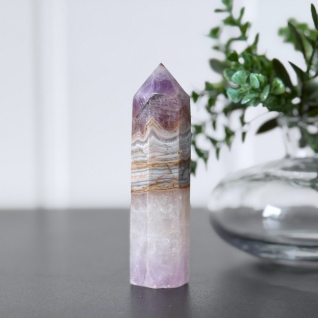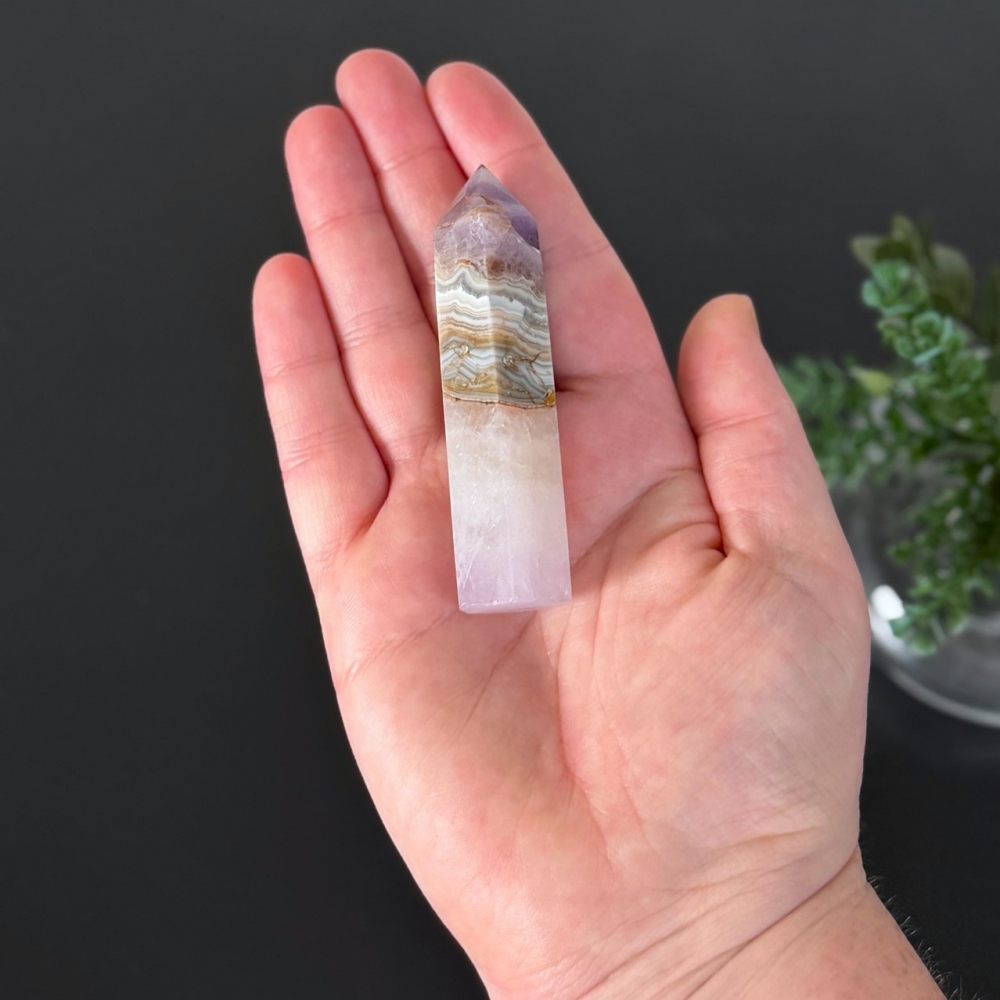 Ametyst med Meksikansk Blondeagat er en krystall for både sinn og sjel - en perfekt forening av ametystens rolige, spirituelle energi og agatens livlige jordkraft. Der ametyst åpner for intuisjon, indre ro og visdom, tilfører blondeagaten glede, stabilitet og en varmende energi som løfter humøret.