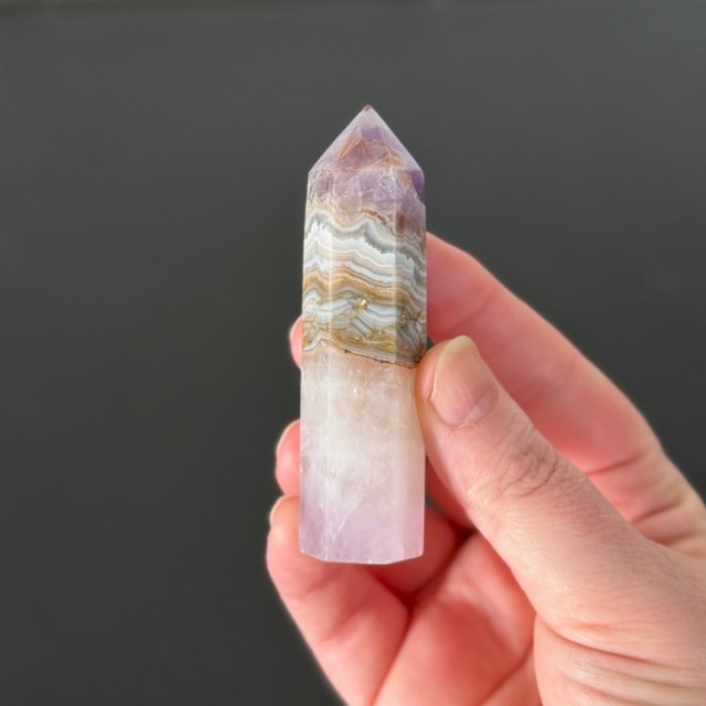 Denne kombinasjonen består av lilla Ametyst - en kvartsvariant kjent for sin vakre farge og Meksikansk Blondeagat, en agat med karakteristiske, blonde-lignende mønstre i lag av hvitt, krem, grått og jordtoner. Blondeagat finnes hovedsakelig i Chihuahua-regionen i Mexico, og kalles ofte Crazy Lace Agate på engelsk. Sammen skaper disse to mineralene et unikt samspill av farger og strukturer, der ametystens krystallinske form møter agatens bølgende bånd.