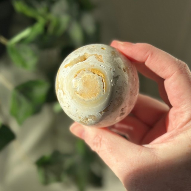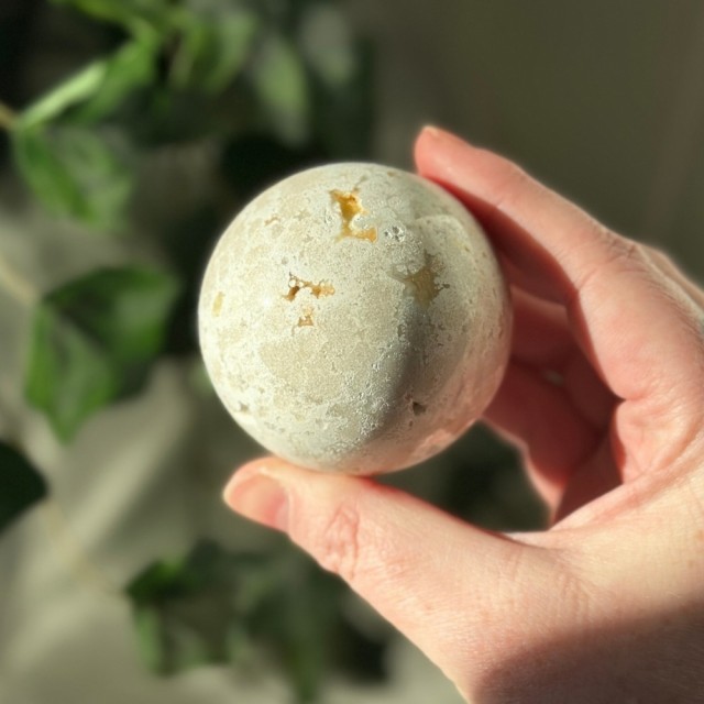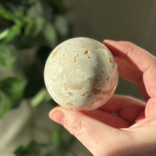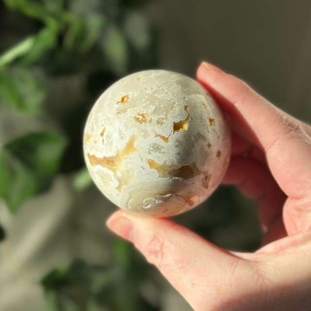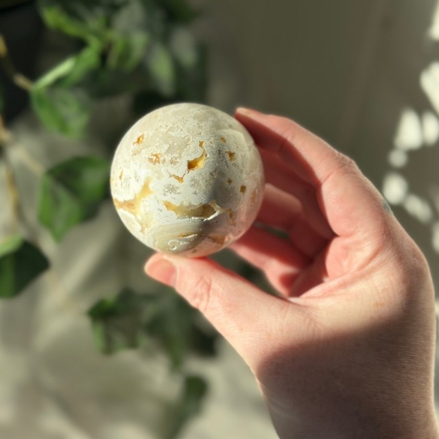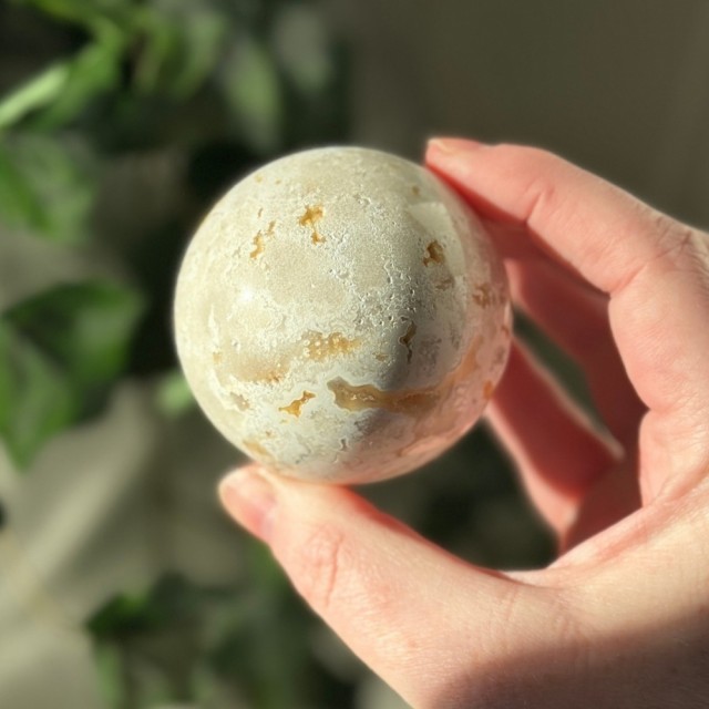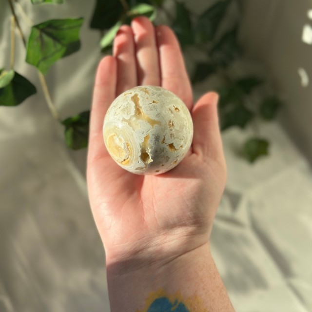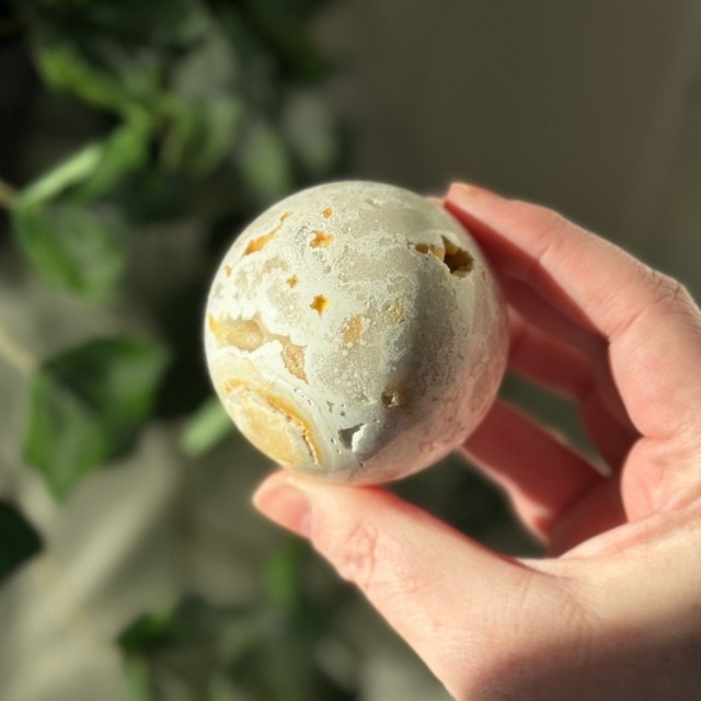 Som et lite stykke sol i krystallform stråler denne Gul Crazy Lace Agat kulen. Med sitt unike mønster bringer den lys, varme og balanse til ethvert rom, og minner deg på å finne glede, kreativitet og harmoni i hverdagen. Denne er 246g og 6,1cm.