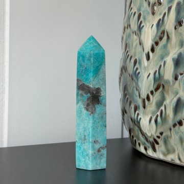 Nydelig Amasonitt tårn på 8,7cm høyde og veier ca 68g. Det gråe i krystallen er Røykkvarts. Det er den krystallen du ser på bildene du får hvis du bestiller denne. OBS: Bildene tatt i studiolys.