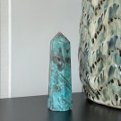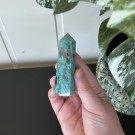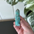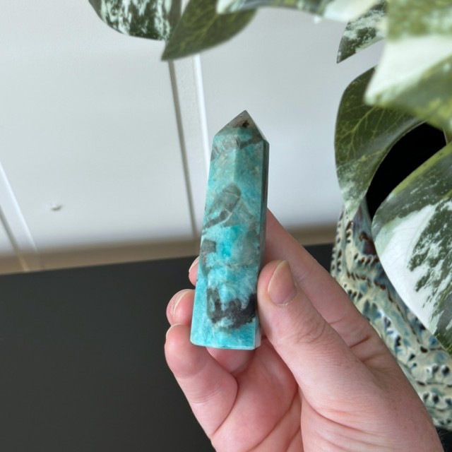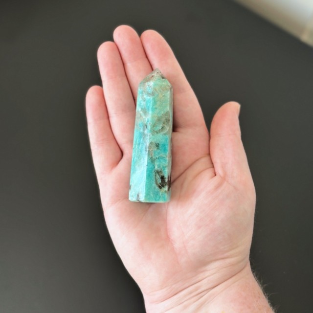 Nydelig Amasonitt tårn på 8,7cm høyde og veier ca 68g. Det gråe i krystallen er Røykkvarts. Det er den krystallen du ser på bildene du får hvis du bestiller denne. OBS: Bildene tatt i studiolys.