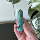 Blå Aragonitt er en beroligende stein som minner om stillheten i havet. Den lindrer stress, styrker kommunikasjon og bringer fred, klarhet og egenkjærlighet. Dette tårnet er 107g og 9,1cm høyt.