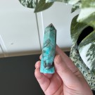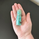 Blå Aragonitt er en beroligende stein som minner om stillheten i havet. Den lindrer stress, styrker kommunikasjon og bringer fred, klarhet og egenkjærlighet. Dette tårnet er 109g og 8,5cm høyt.