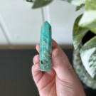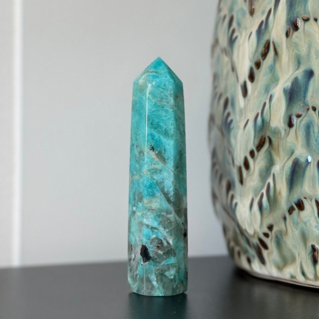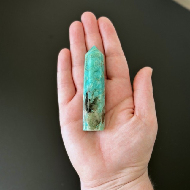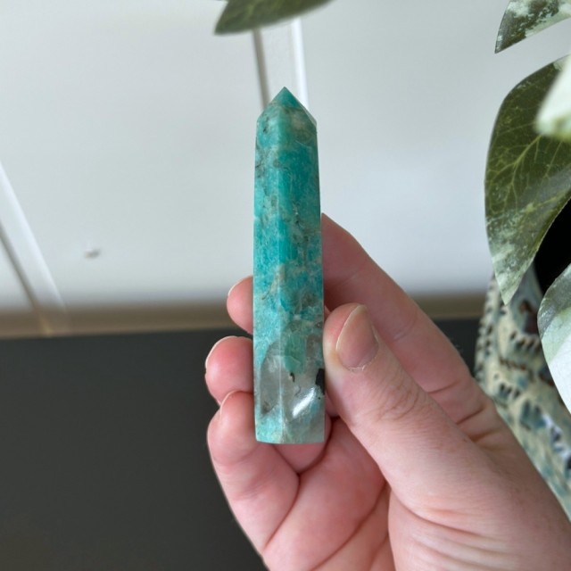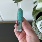 Nydelig Amasonitt tårn på 8,7cm høyde og veier ca 68g. Det gråe i krystallen er Røykkvarts. Det er den krystallen du ser på bildene du får hvis du bestiller denne. OBS: Bildene tatt i studiolys.