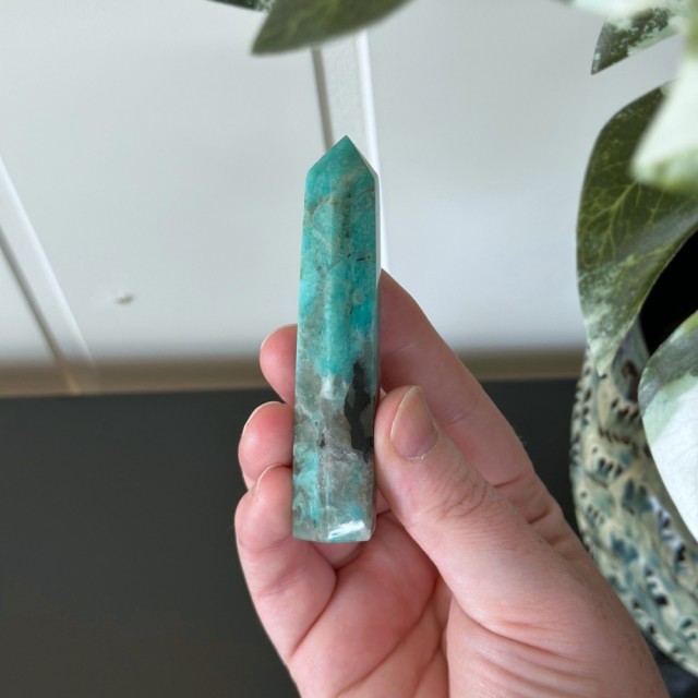 Nydelig Amasonitt tårn på 7,9cm høyde og veier ca 65g. Det gråe i krystallen er Røykkvarts. Det er den krystallen du ser på bildene du får hvis du bestiller denne. OBS: Bildene tatt i studiolys.