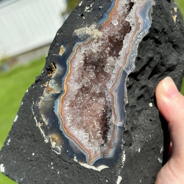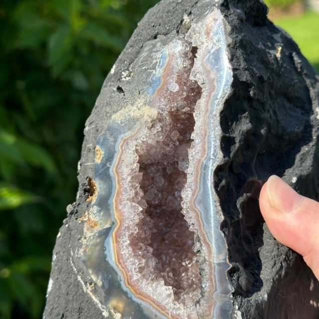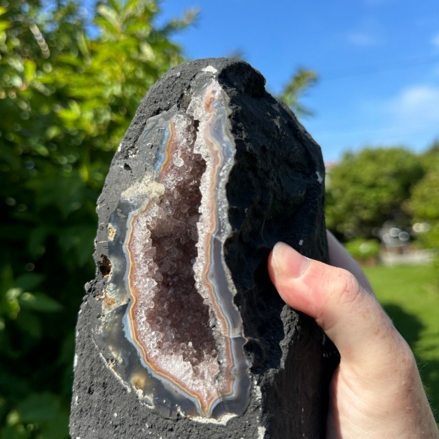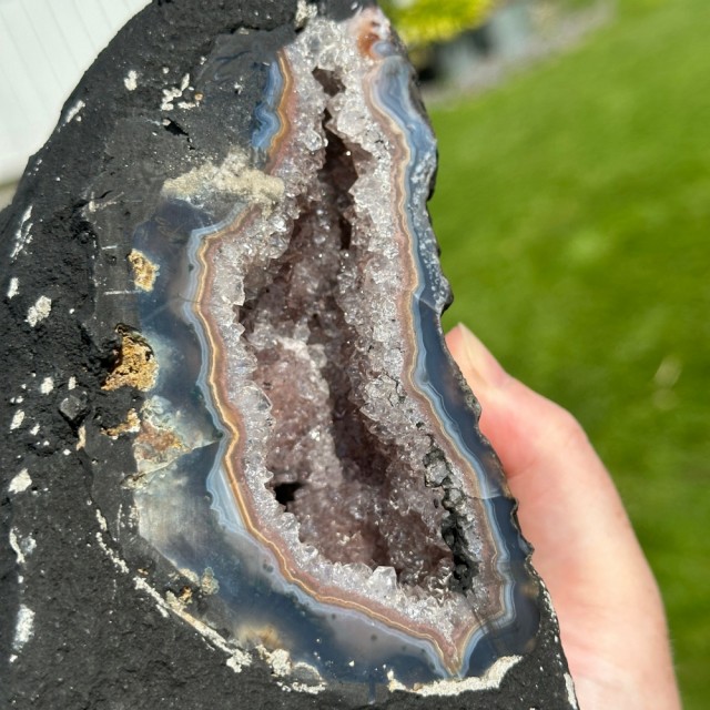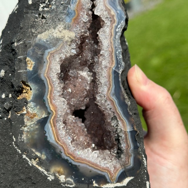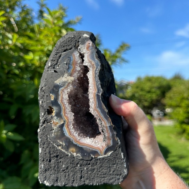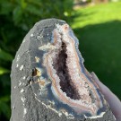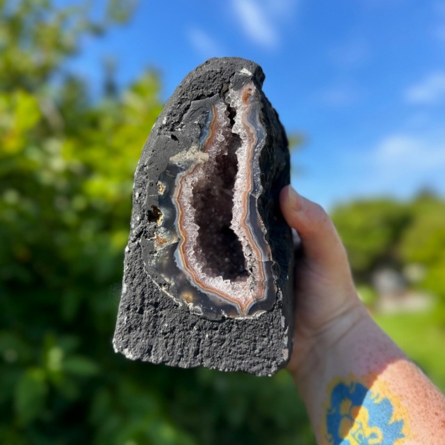 Et naturlig kunstverk fra Moder Jord - dette hjertet i Agat rommer en krystallhule av glitrende drusy ametyst. En perfekt kombinasjon av jordende stabilitet og høyvibrerende energi som bringer ro, kjærlighet og klarhet. Små merker forekommer.