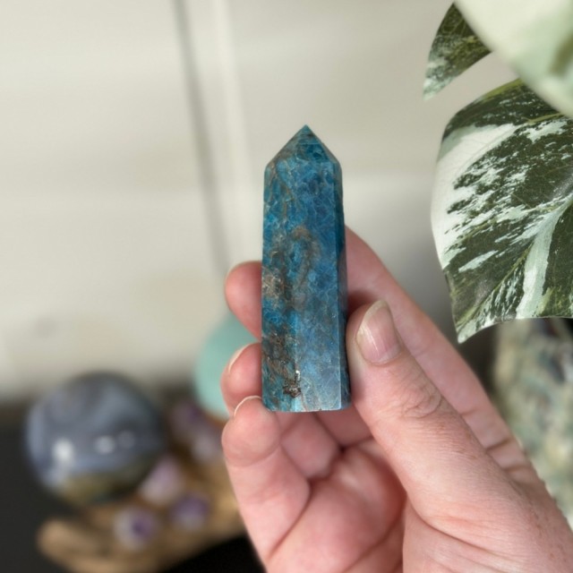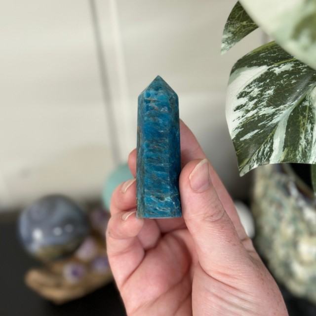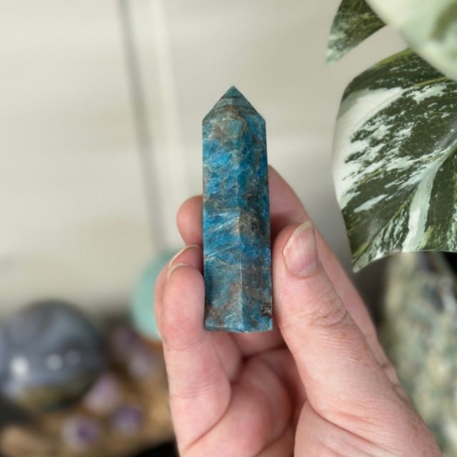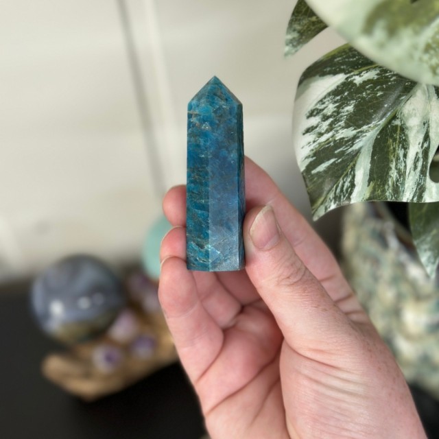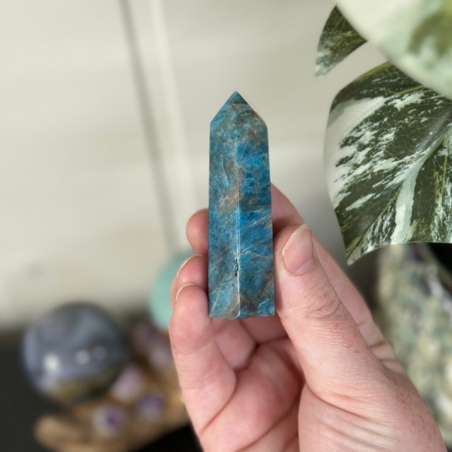 Nydelig Blå Apatitt tårn. Dette er 7cm høyt og veier ca 64g. Det er den krystallen du ser på bildene du får hvis du bestiller denne. Naturlige merker og små druser forekommer.