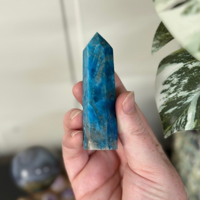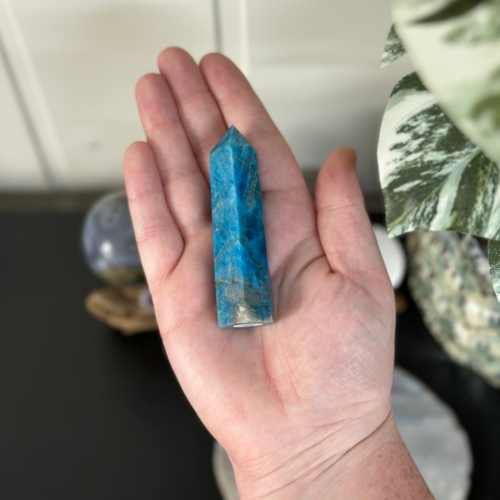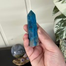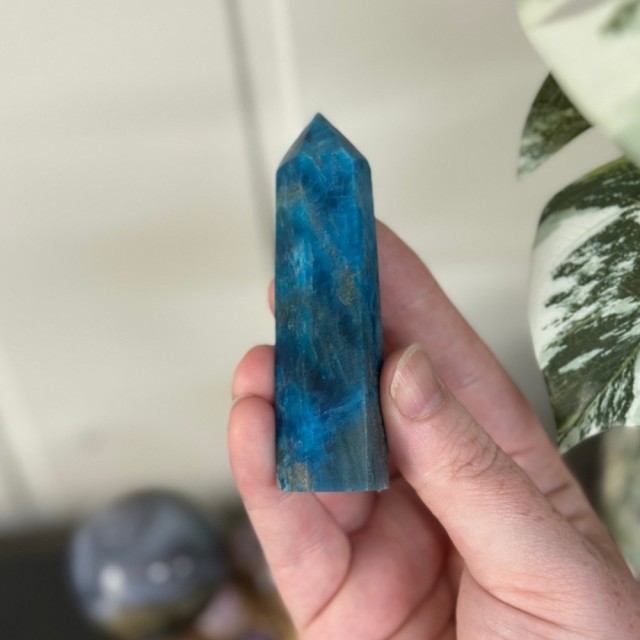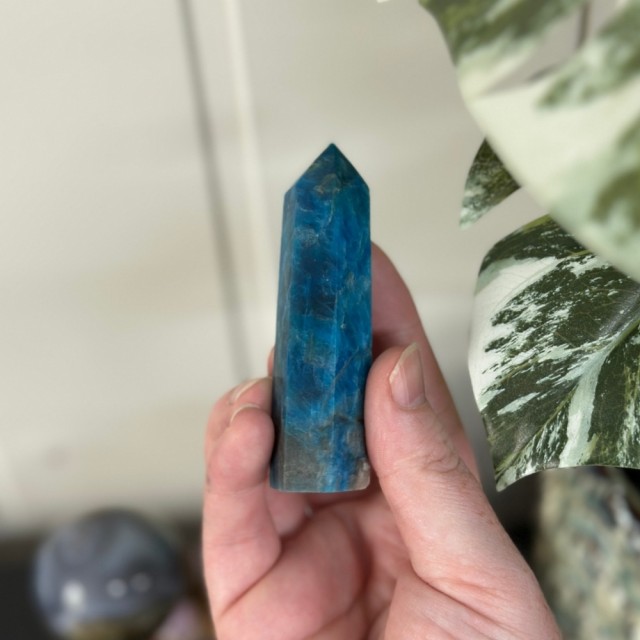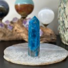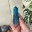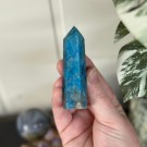 Nydelig Blå Apatitt tårn. Dette er 8,1cm høyt og veier ca 85g. Det er den krystallen du ser på bildene du får hvis du bestiller denne. OBS: Står litt skeivt men vises bare i noen retninger.