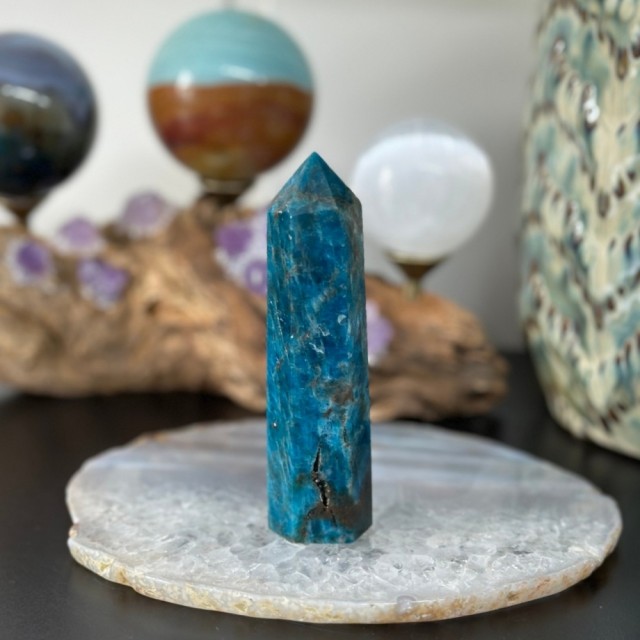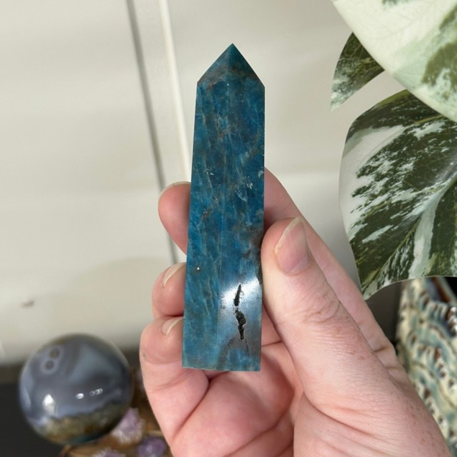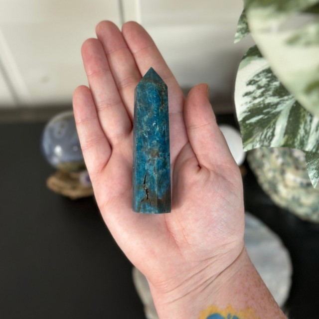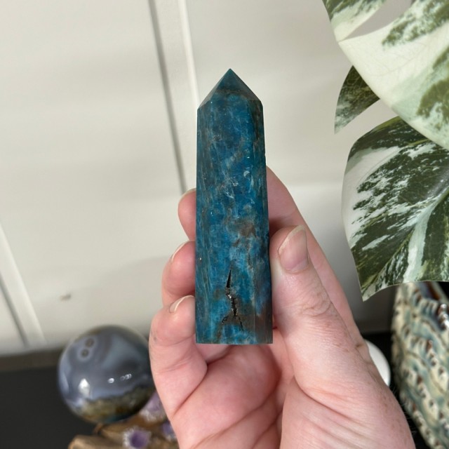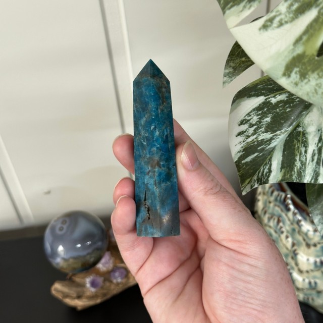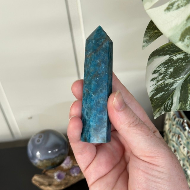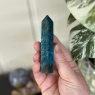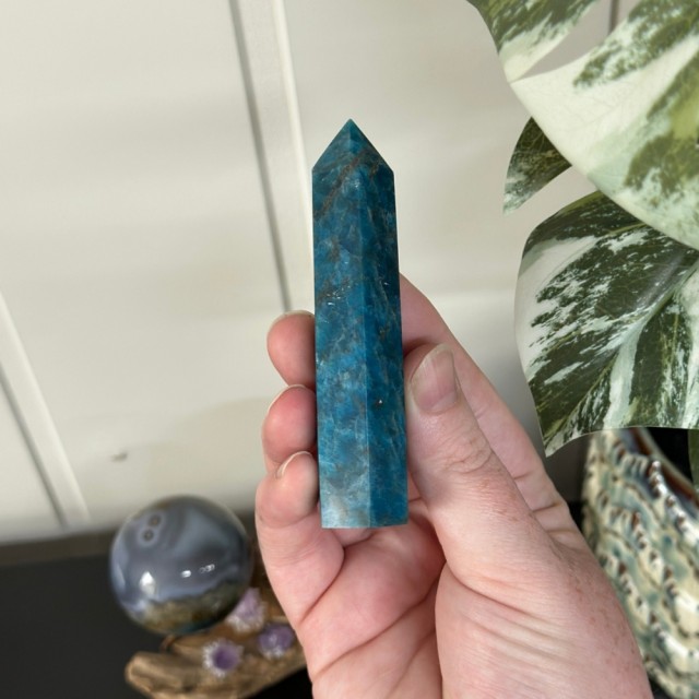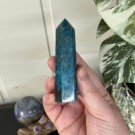 Nydelig Blå Apatitt tårn. Dette er 9,2cm høyt og veier ca 97g. Naturlige druser forekommer på denne. Det er den krystallen du ser på bildene du får hvis du bestiller denne.