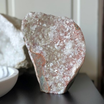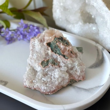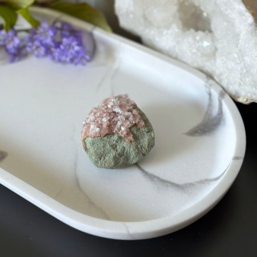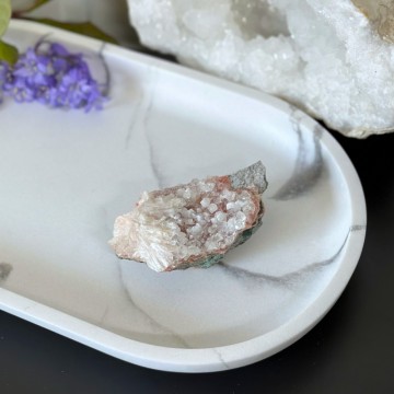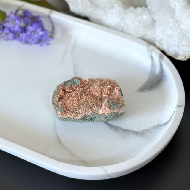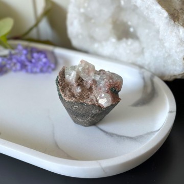 En unik krystallkombinasjon som bringer lys, ro og jording. Heulanditt, Skolesitt & Tre Agat jobber sammen for dyp healing og spirituell støtte. Denne er ca 65g og 5,9cm. OBS: Naturlige merker, groper og cracks forekommer.