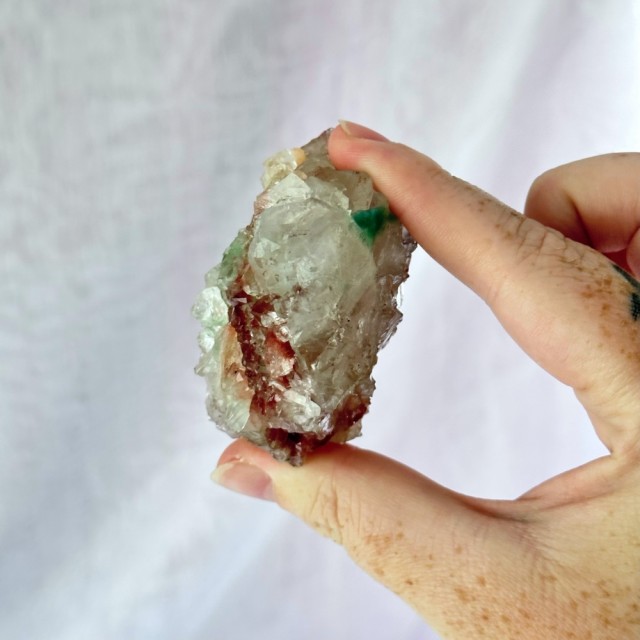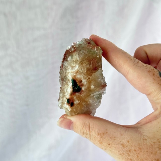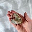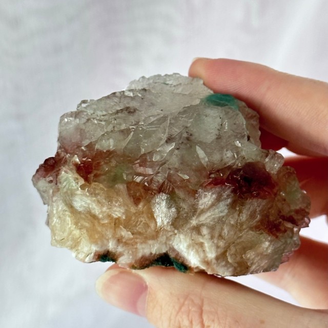 Nydelig rød & grønn Apofylitt (Apophylitt) gruppe fra Indonesia. Denne drusebiten veier ca 118g og er ca 6,8cm. Det er den på bildene du får om du bestiller denne. PS: Bildene er tatt i fotolys.