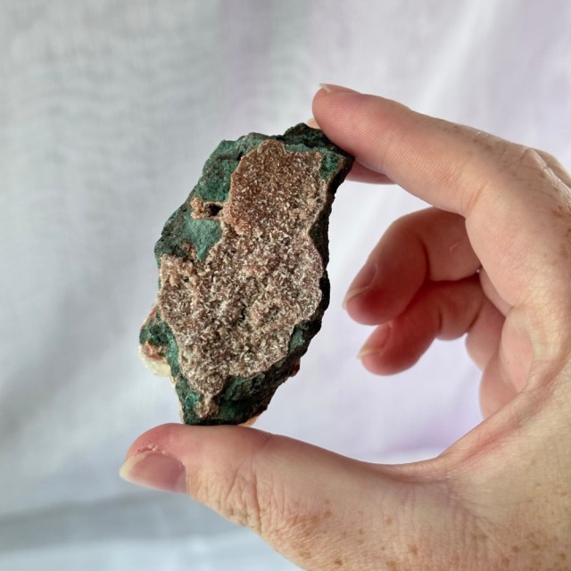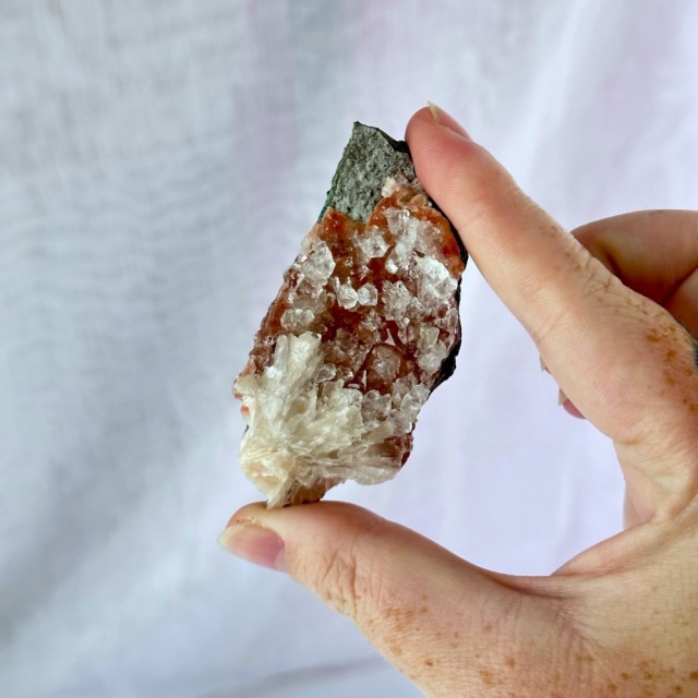 Nydelig liten rød Apofylitt (Apophylitt) drusy på stein fra Indonesia. Denne steinen veier ca 46g og er ca 5,3cm. Det er den på bildene du får om du bestiller denne. PS: Bildene er tatt i fotolys.