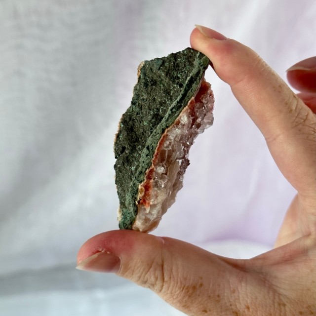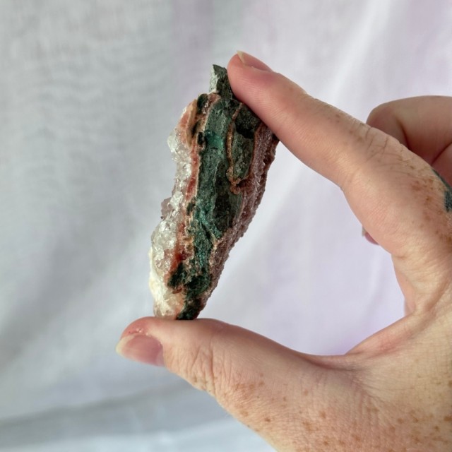 Nydelig rød & grønn Apofylitt (Apophylitt) gruppe fra Indonesia. Denne drusebiten veier ca 118g og er ca 6,8cm. Det er den på bildene du får om du bestiller denne. PS: Bildene er tatt i fotolys.