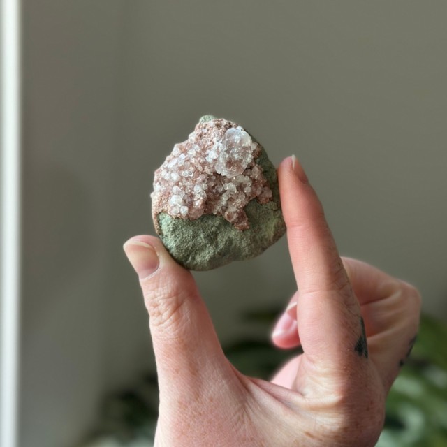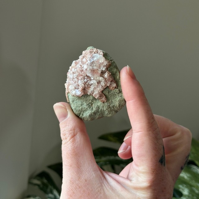 Nydelig liten rød Apofylitt (Apophylitt) drusy på stein fra Indonesia. Denne steinen veier ca 46g og er ca 5,3cm. Det er den på bildene du får om du bestiller denne. PS: Bildene er tatt i fotolys.