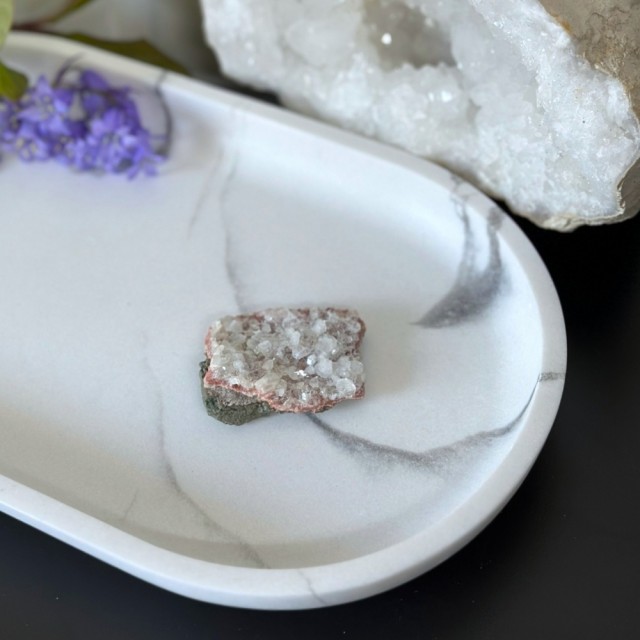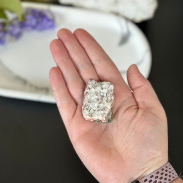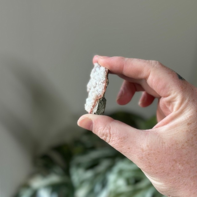 Nydelig liten rød Apofylitt (Apophylitt) drusy på stein fra Indonesia. Denne steinen veier ca 46g og er ca 5,3cm. Det er den på bildene du får om du bestiller denne. PS: Bildene er tatt i fotolys.