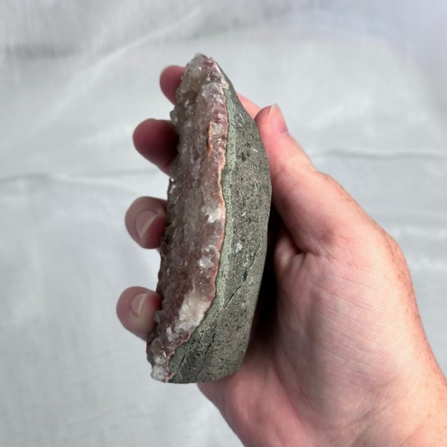 Nydelig liten rød Apofylitt (Apophylitt) drusy på stein fra Indonesia. Denne steinen veier ca 46g og er ca 5,3cm. Det er den på bildene du får om du bestiller denne. PS: Bildene er tatt i fotolys.