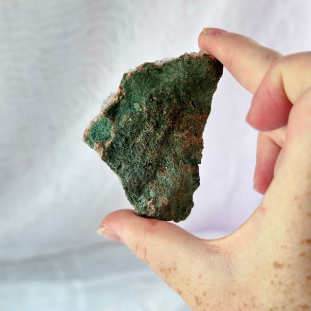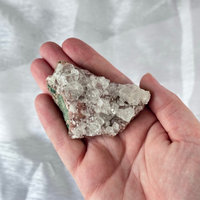 Nydelig rød & grønn Apofylitt (Apophylitt) gruppe fra Indonesia. Denne drusebiten veier ca 118g og er ca 6,8cm. Det er den på bildene du får om du bestiller denne. PS: Bildene er tatt i fotolys.
