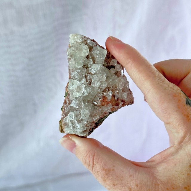 Nydelig rød liten Apofylitt (Apophylitt) gruppe fra Indonesia. Denne drusebiten veier ca 122g og er ca 5cm. Det er den på bildene du får om du bestiller denne. PS: Bildene er tatt i fotolys.