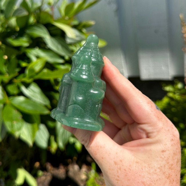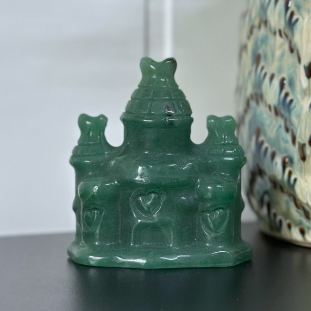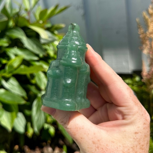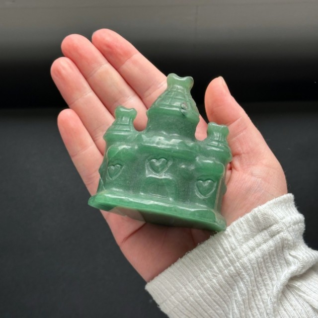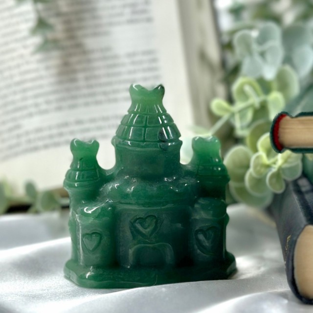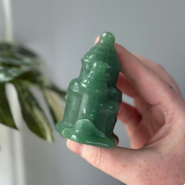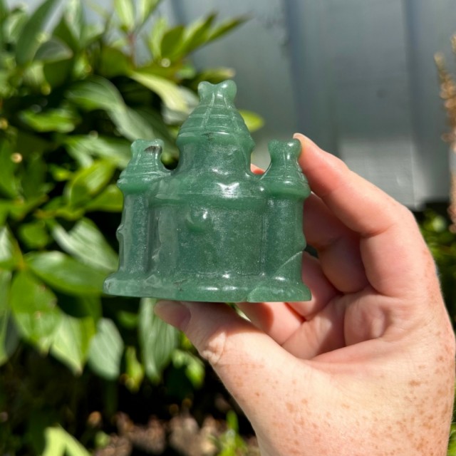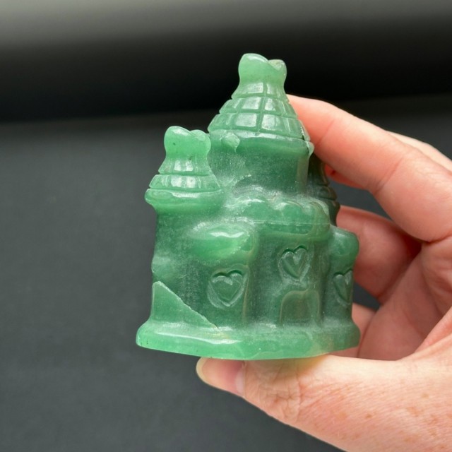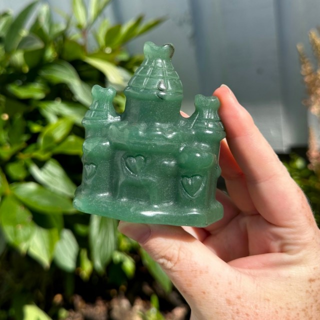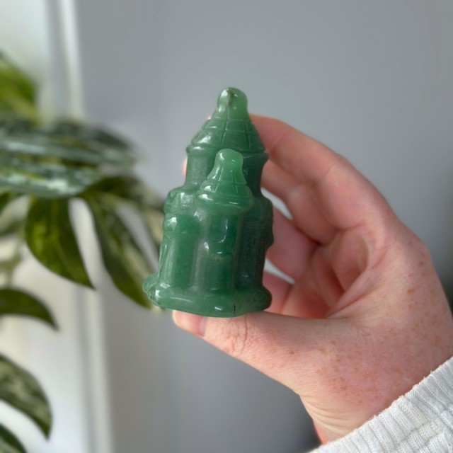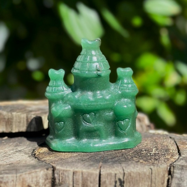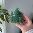 Grønn Aventurin Castle/Slott. Denne er ca 8x7,3cm og veier ca 274g. Det er den på bildene du får hvis du bestiller denne. PS: Redusert pris pga små merker/hakk forekommer, se bilder før kjøp.
