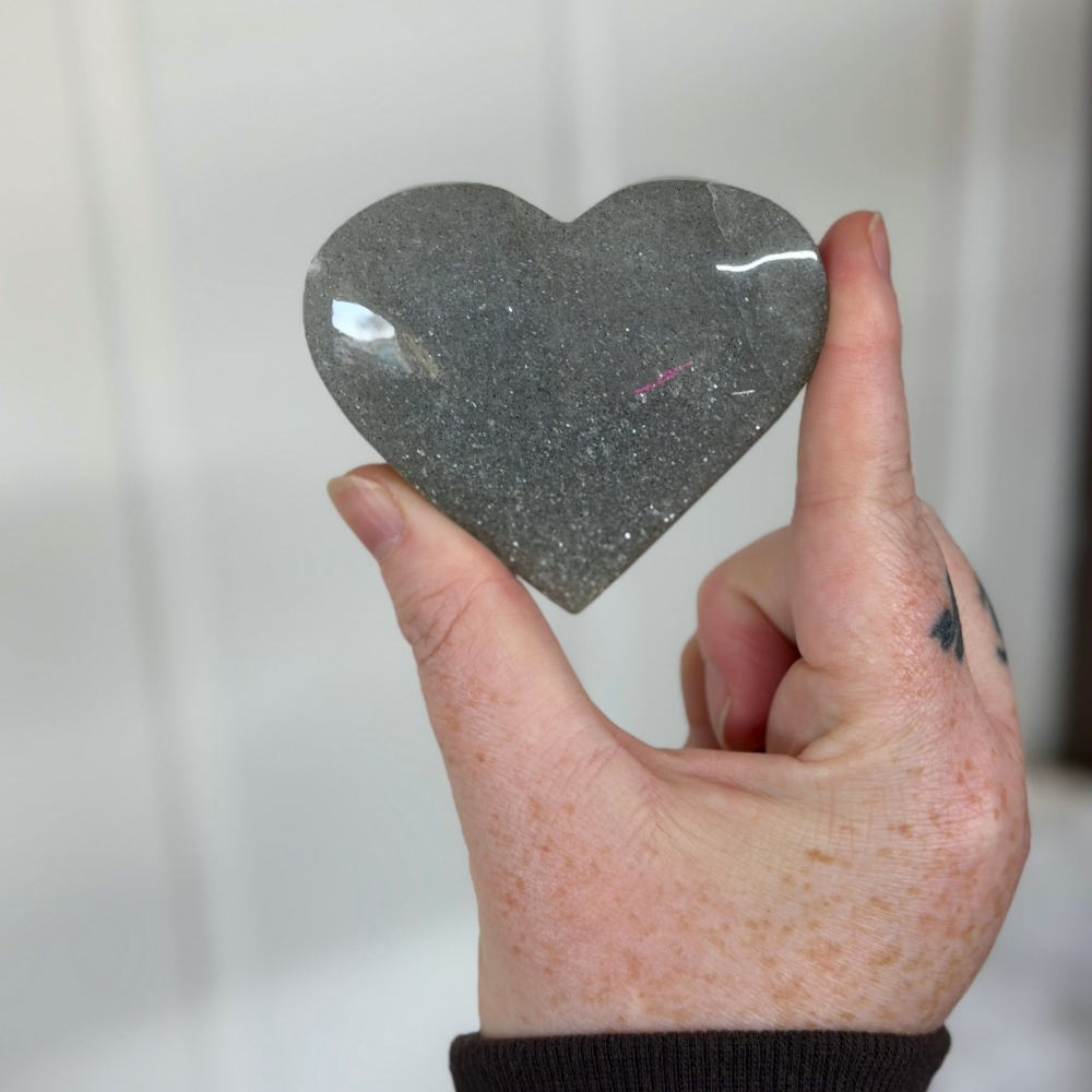 Sage Aventurin er en rolig og jordende stein med myke grønngrå toner og subtile mica-glimt. Dette hjerteformede stykket symboliserer indre balanse, trygghet og stille vekst – en vakker påminnelse om å lande i deg selv og puste dypere. 6,5x7,7x2,1cm/ 149g.
