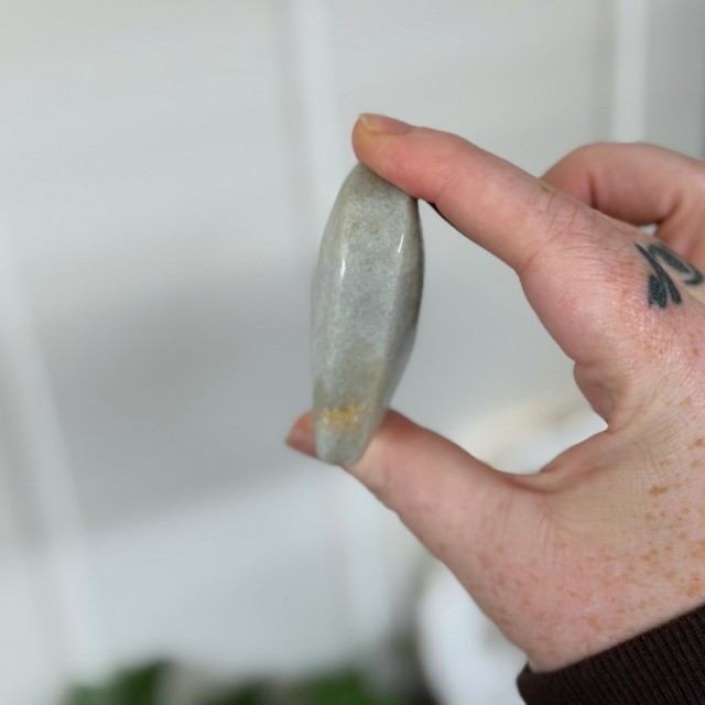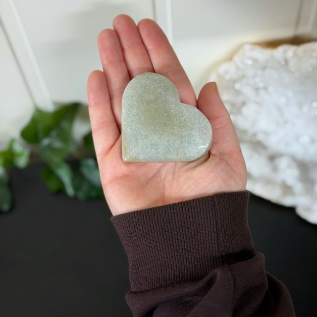 Sage Aventurin er en rolig og jordende stein med myke grønngrå toner og subtile mica-glimt. Dette hjerteformede stykket symboliserer indre balanse, trygghet og stille vekst – en vakker påminnelse om å lande i deg selv og puste dypere. 6x7x2,3cm/ 130g.