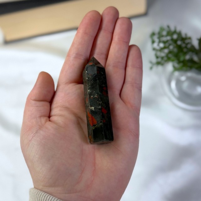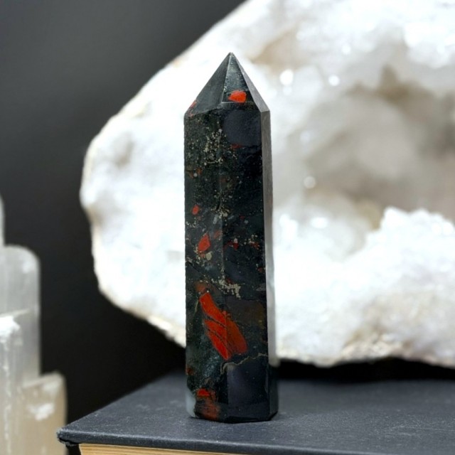 Som jordens egen puls bærer Afrikansk Blodstein rå styrke og ro. En stein for mot, balanse og indre kraft. Perfekt når du trenger å finne tilbake til deg selv. Dette tårnet er 7,6cm og veier 50g. Denne har Pyritt i seg.