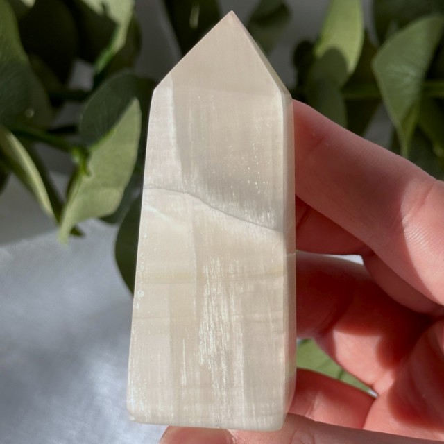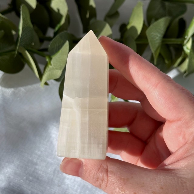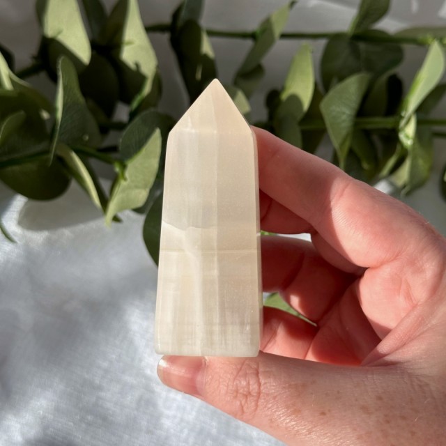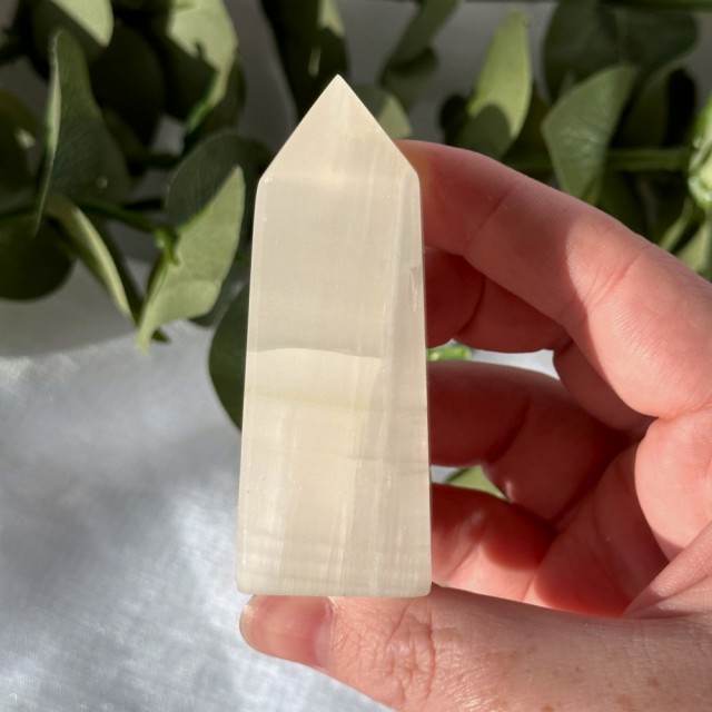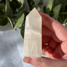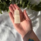Nydelig Hvit Kalsitt tårn på 124g og er 7,4cm høy. Det er den krystallen på bildet du får hvis du bestiller denne.
