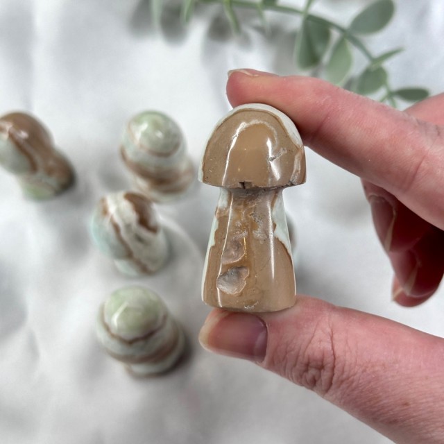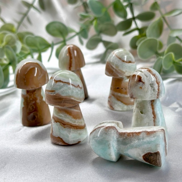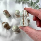 Nydelige Sjokolade Kalsitt (Brun Aragonitt) mini sopper. Disse er ca 3,3-3,6cm høye. Prisen er per stk. Naturlige merker forekommer.