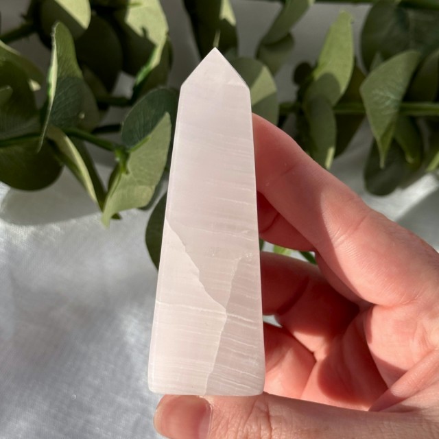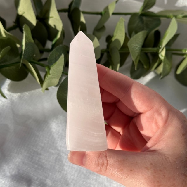 Nydelig Rose Kalsitt tårn på 10,1cm og veier ca 246g. Det er den på bildene du får hvis du bestiller denne. Små minimale merker forekommer.