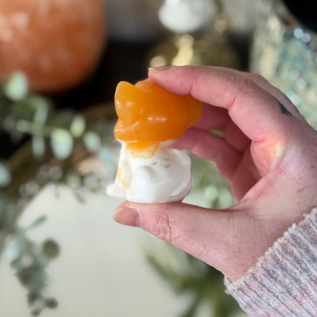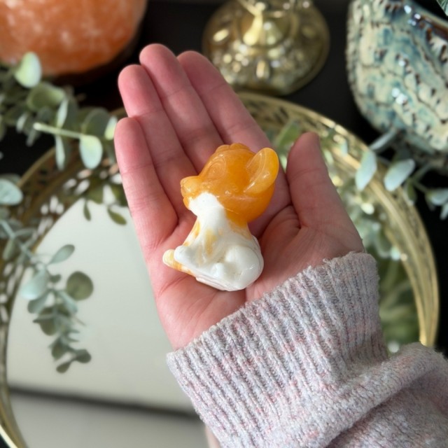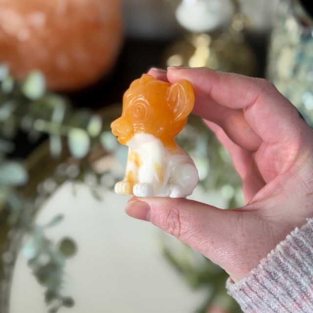 Liten majestetisk Simba figur i glødende oransje bånd kalsitt med vakre, naturlige mønstre. Måler 5,6x4,7x3,6cm og veier ca 116g. En kraftfull figur som symboliserer mot, styrke og indre ild - perfekt for deg som vil ha solenergi i rommet.