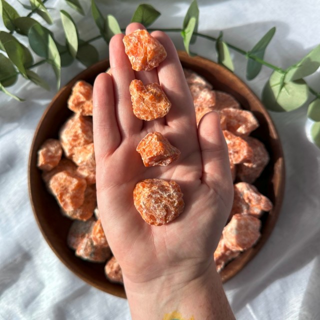 Orkide/Ild Kalsitt råbiter. Disse vakre oransje råsteinene er små/medium i størrelsen (se bilder for bedre størrelse informasjon). Vekten på disse varierer fra ca 20-50g. Prisen du ser er per stk råstein. Størrelse og farge vil variere. Tilfeldig plukket.