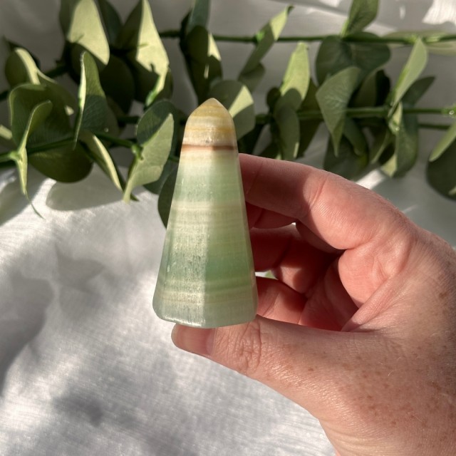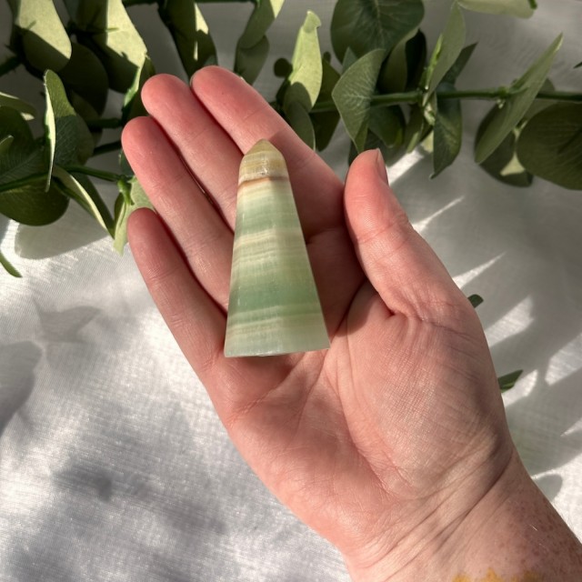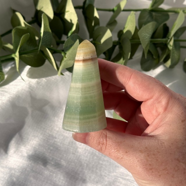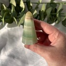 Pistasj Kalsitt (Grønn Kalsitt) tårn/point på 6,9cm og veier ca 96g. Det er den på bildene du får hvis du bestiller denne. Små merker kan forekomme.