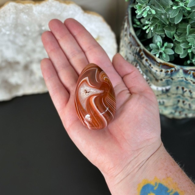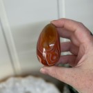 Nydelig juicy Karneol formet som et egg. Dette er 6,4x4x3,1cm og veier ca 108g. Det er den krystallen du ser på bildene du får hvis du bestiller denne. OBS: Bildene er tatt i studiolys.