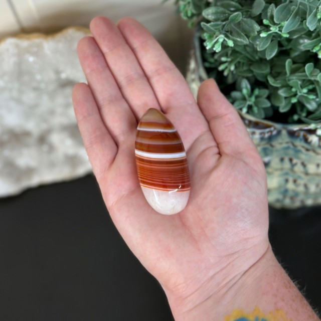 Karneol krystallen er en stabiliserende krystall, perfekt for forankring i nåtiden. Dens høye energi hjelper til med å gjenopprette tapt vitalitet og motivasjon og stimulerer kreativitet for nye sysler. Den forbedrer konsentrasjonen og fjerner fremmede tanker hos dagdrømmere og under meditasjon.