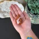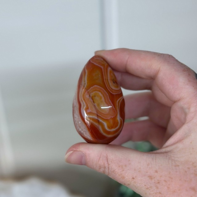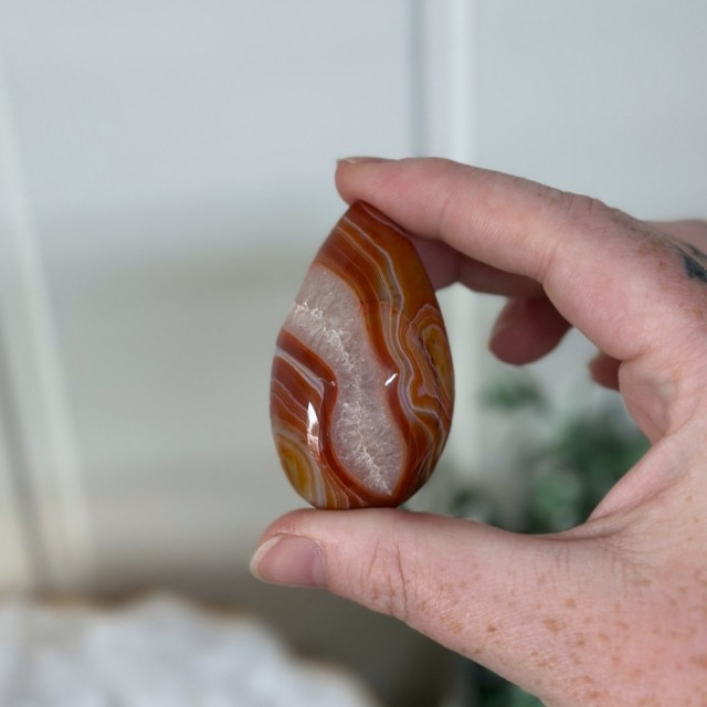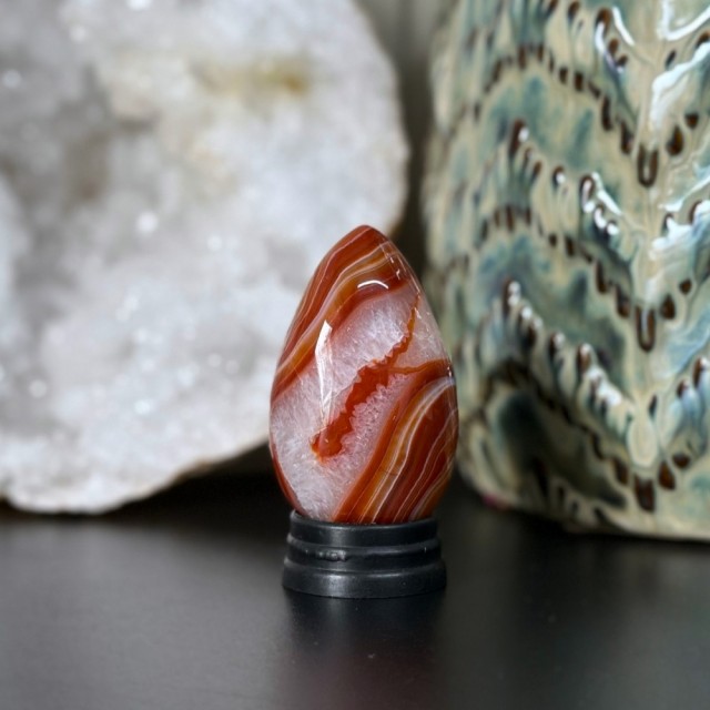Karneolens energi er både jordende og oppmuntrende. Den hjelper deg å stå stødig, samtidig som den gir kraft til å følge drømmene dine med mot og entusiasme. Som en stabiliserende stein bringer den balanse mellom kropp og sinn, og inspirerer til å møte livet med lidenskap, klarhet og håp.