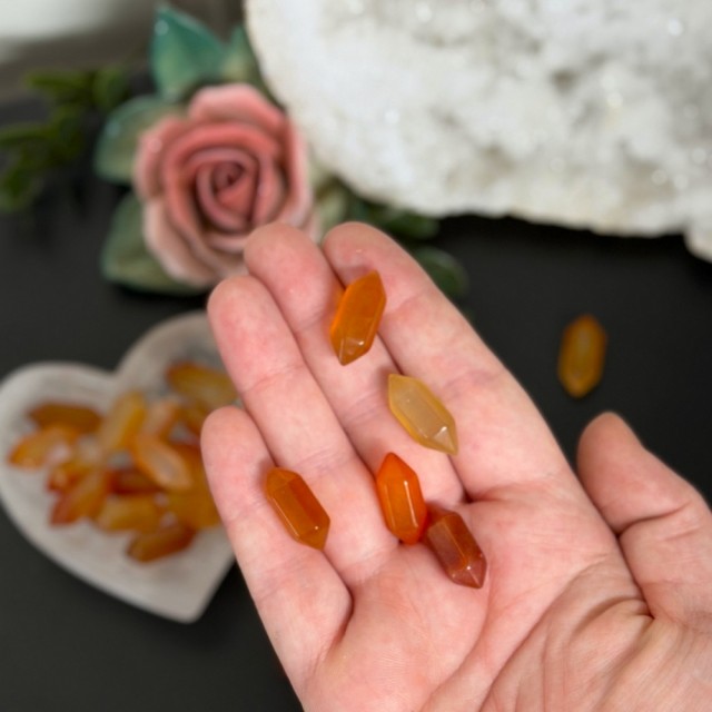 Karneol er en varm og livlig krystall som gir energi, kreativitet og selvtillit. Den beskytter mot misunnelse og frykt, og hjelper deg å finne tilbake til lidenskap, glede og handlekraft i hverdagen. Disse DT'ene er ca 2cm, prisen er per stk.