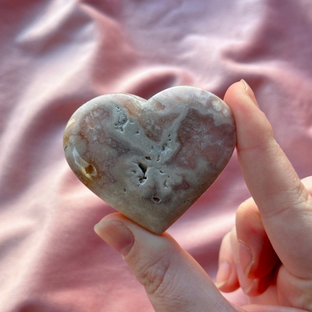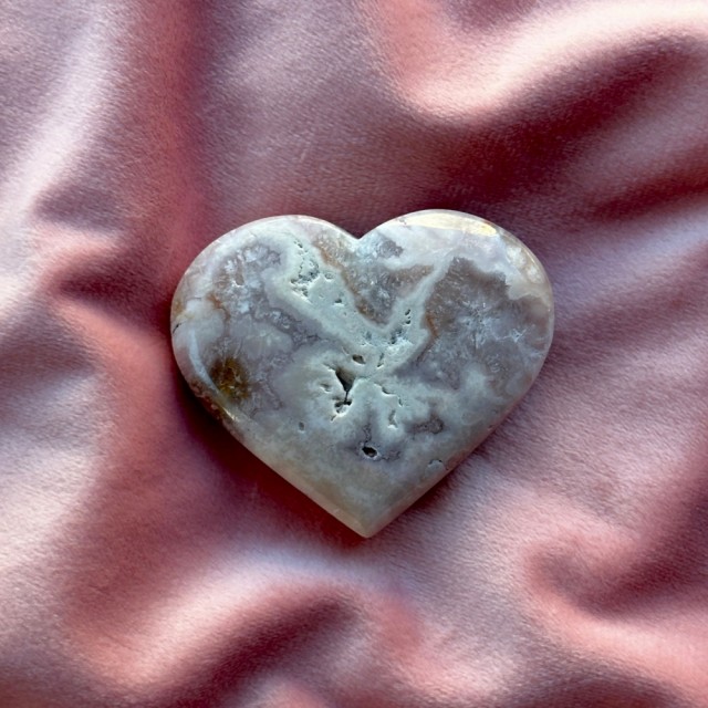 Et hjerte skapt av tid, jord og magi. Denne naturlige agaten med glitrende drusy krystaller bringer ro, klarhet og jordende energi inn i rommet ditt – et symbol på naturens skjønnhet og hjertets indre lys. Små merker forekommer. Stand medfølger ikke.