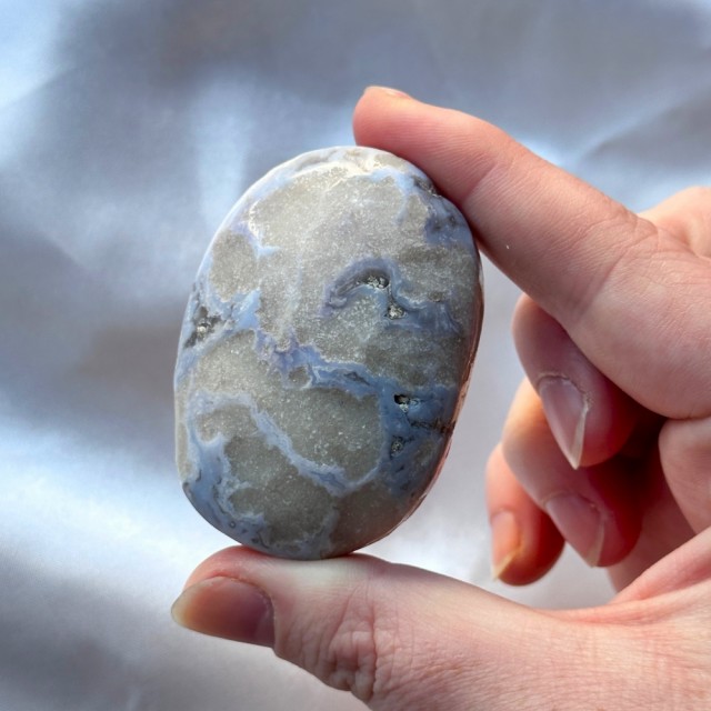 Nydelig Grp Agat håndstein med liten drusy lomme og dendritt. Denne er 5,8x4,1x2,1cm og veier ca 79g.