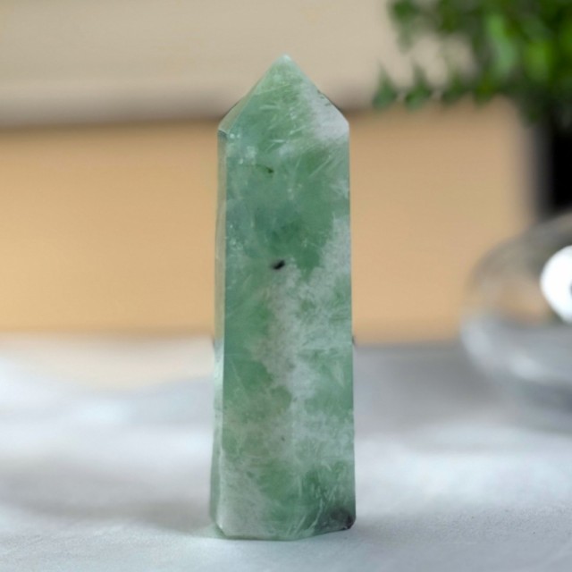 Grønn Feather Fluoritt er en utrolig vakker og beroligende stein som kombinerer fluorittens klare, rensende energi med en mykere, mer flytende og nesten drømmende følelse.