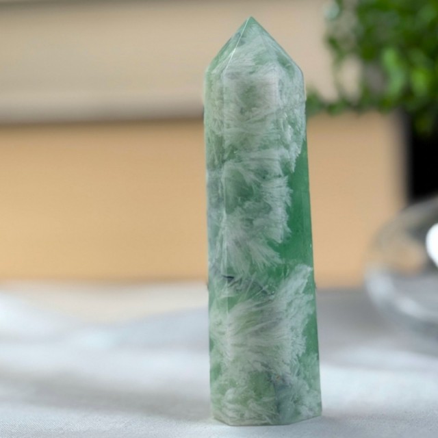 Grønn Feather Fluoritt er en utrolig vakker og beroligende stein som kombinerer fluorittens klare, rensende energi med en mykere, mer flytende og nesten drømmende følelse.