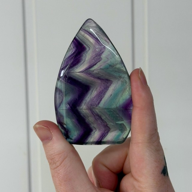 Nydelig Regnbue Fluoritt dråpe. Denne er 116,4g og har målene 8x5,1x1,5cm. Bildene er tatt i dagslys + sollys både inne og ute for å vise frem fargene. OBS: Denne har litt merker/groper i seg.