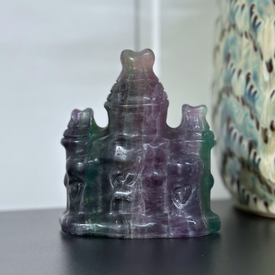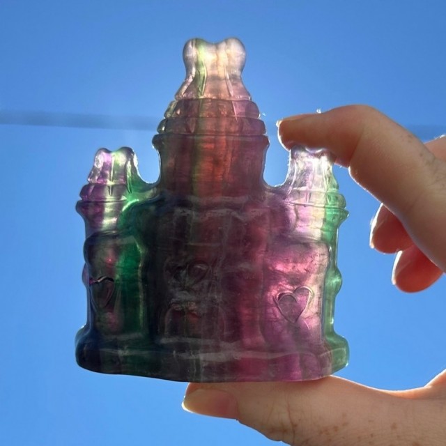 Regnbue Fluoritt tårn på 136g og er 10,8cm høy. **Redusert pris pga står litt skeivt.