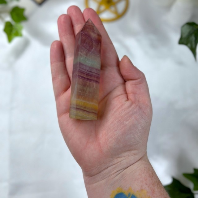 Nydelig Regnbue Fluoritt tårn på 135,5g og er 10,7cm høyde. **Redusert pris pga står skeivt.
