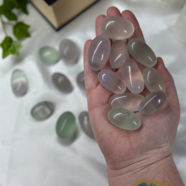 Lys Candy Fluoritt tromlet. Disse er ca 19-40g og 3-4cm. **Redusert pris pga små merker kan forekomme. Tilfeldig plukket!