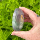 Feather Fluoritt hjerte. Dette er 4,6x5,3x1,9cm og veier ca 81g. Små naturlige merker forekommer.