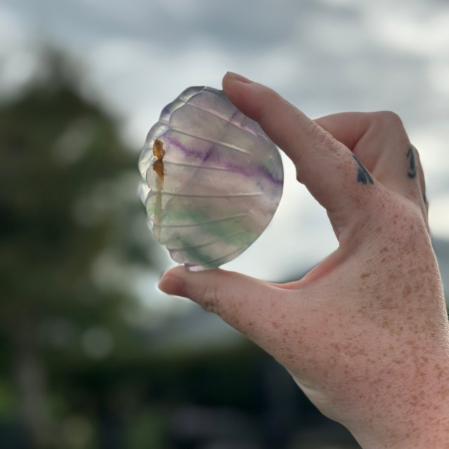 En stjerne av Regnbue Fluoritt som minner deg om å følge din egen vei. Naturens farger danser i lyset og bringer ro, balanse og mental klarhet til rommet. Høyde med stand: ca 19cm - uten stand: 12,7x8,3x1,8cm. Vekt: 118g.